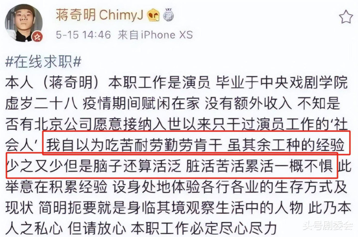 疫情期间没了观众,话剧表演根本赚不了钱,没有任何收入的他只能放下尊严,在微博发布“求职文章毛遂自荐。